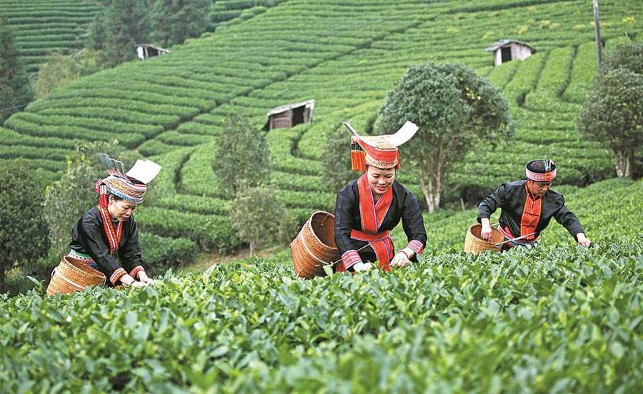 茶農在大樟鄉三古村茶園采摘茶葉。 (金秀縣委宣傳部供圖)