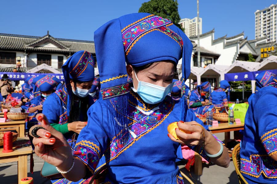 鹽津鋪子的工人正在檢查包裝好的芒果干。