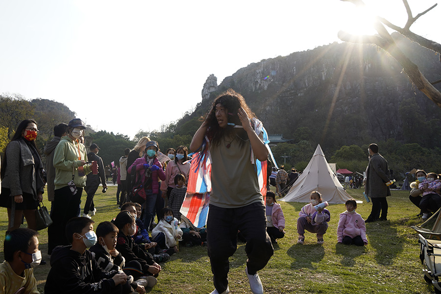 在七星公園華夏之光廣場的大草坪上,五頂白色帳篷散落各處,市民游客圍了一圈又一圈。這里正在舉行《城市的顏色-桂林:一起去桂林》參與式劇場活動,五組來自全國各地的藝術家扎起露營帳篷,在喀斯特山峰的天然布景下,5個帳篷化身5間劇場,帶來5場別具一格的演出。
