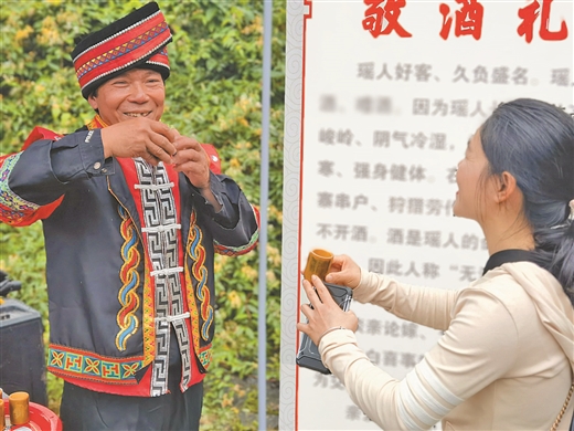 游客與當地瑤族同胞互敬美酒、互致祝福。