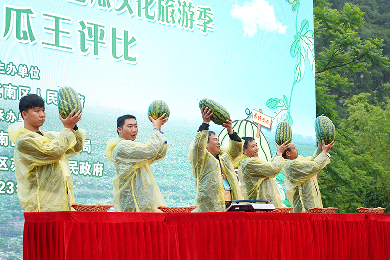 最引人關注的是瓜王爭霸賽,比賽按照黑美人、綠爽、甜王三個西瓜品種進行分類比拼,經過各村初賽篩選,現場對西瓜的重量、品相進行打分,蘇圩鎮敬團村種植大戶劉幫猛以兩個品種排名第一的成績喜獲“西瓜王”稱號。