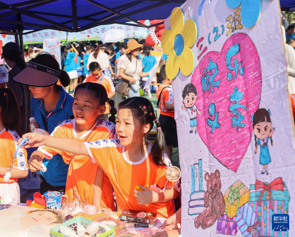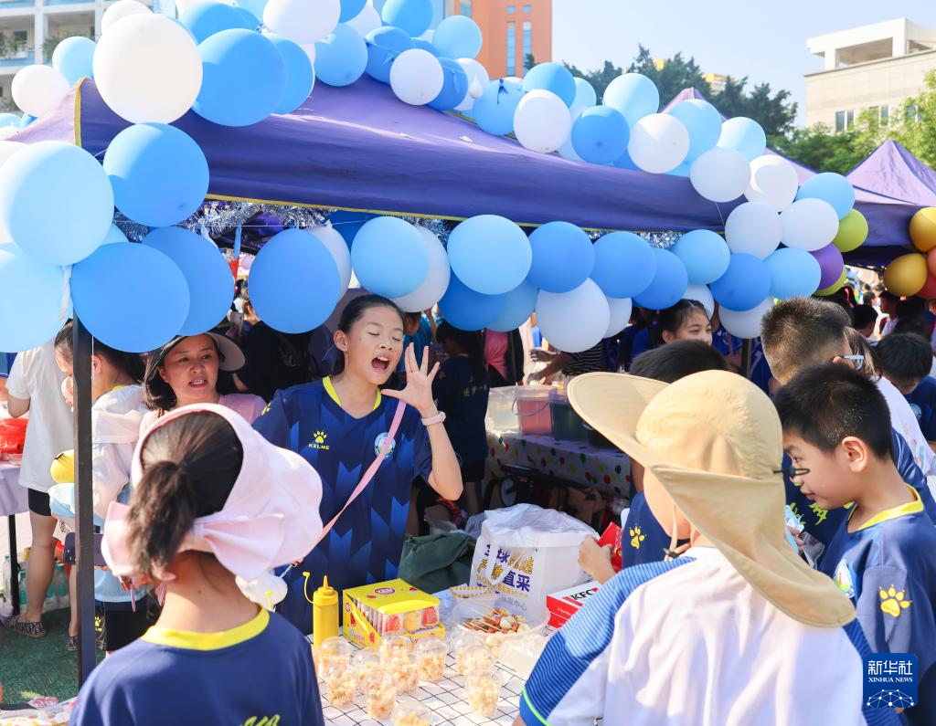 5月31日,在廣西南寧市濱湖路小學,學生在參與“紅領巾公益市集”義賣活動。