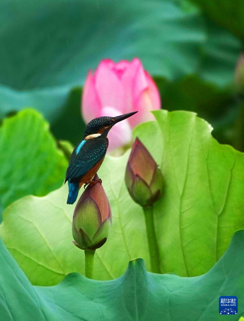6月9日,一只小鳥在廣西南寧市青秀山景區荷塘的荷苞上停留。