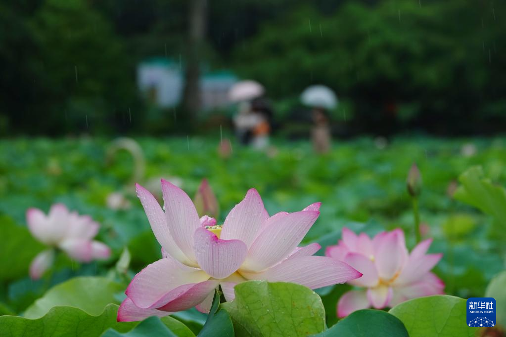6月9日,游人在廣西南寧市青秀山景區欣賞雨中荷花。