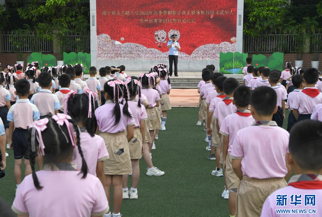 6月30日,民警在廣西南寧市玉蘭路小學科普暑期預防未成年人意外傷害知識。