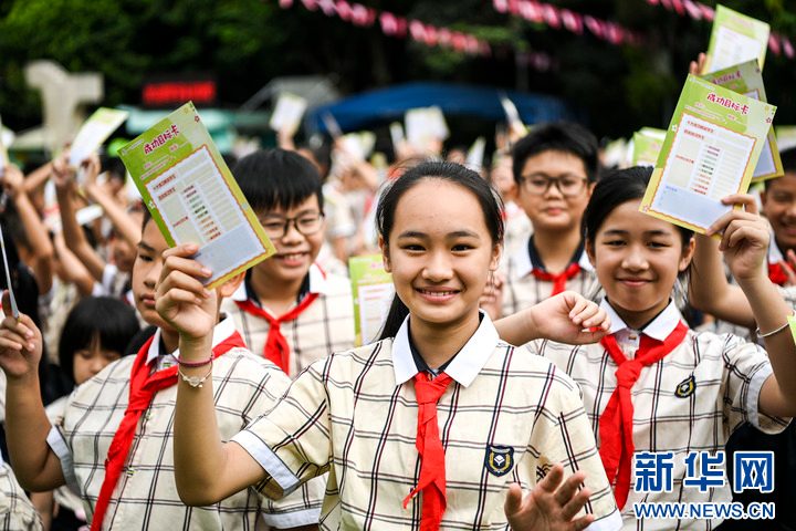 8月28日,在廣西南寧市民族大道東段小學,校長羅瑩為學生代表贈送成功目標卡。