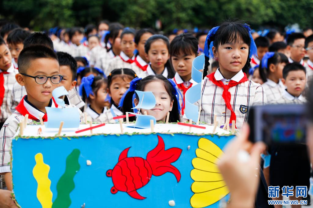 8月28日,南寧市濱湖路小學的學生們和校長謝小燕一起將學生自制的“夢想船”放入水中。