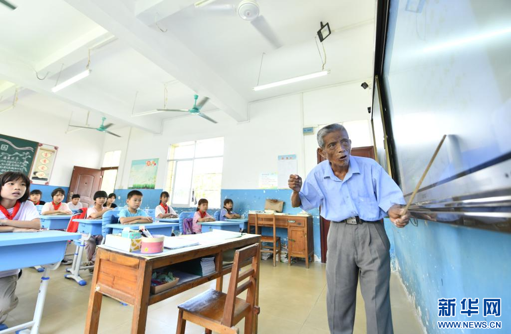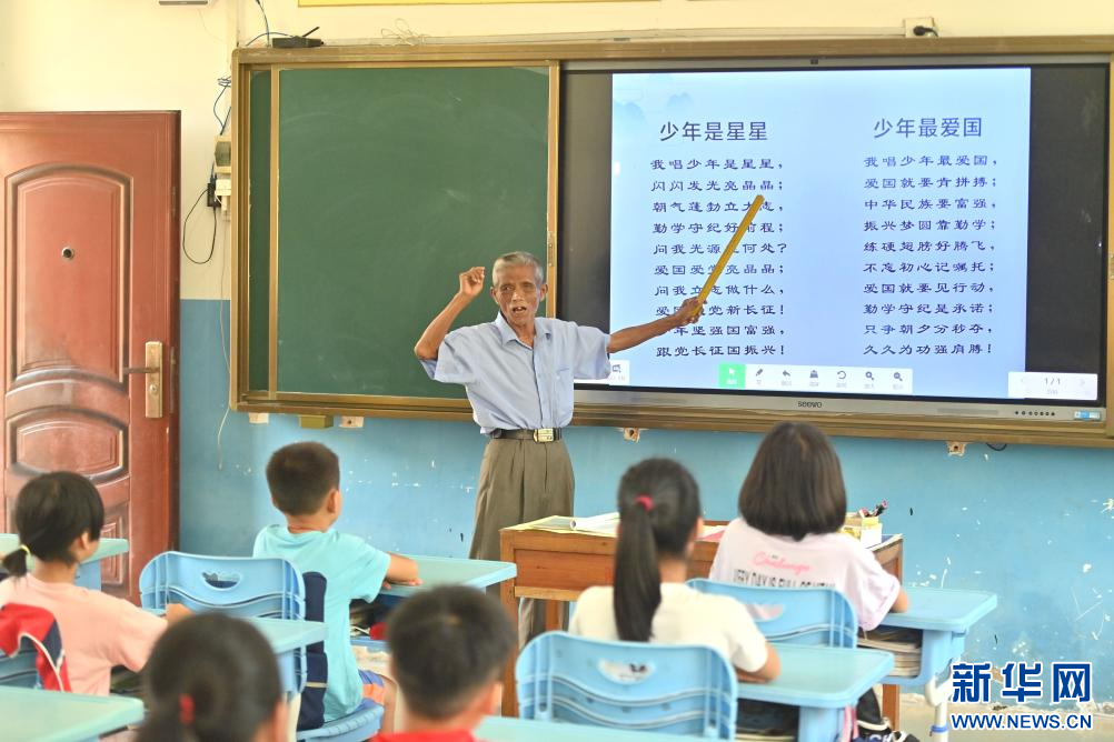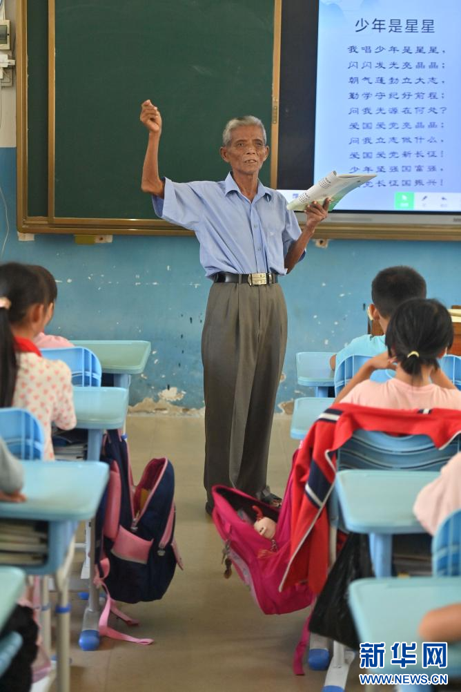 在梧州市長洲區長洲鎮泗洲小學,陳明仲在教孩子們唱下俚歌(9月5日攝)。