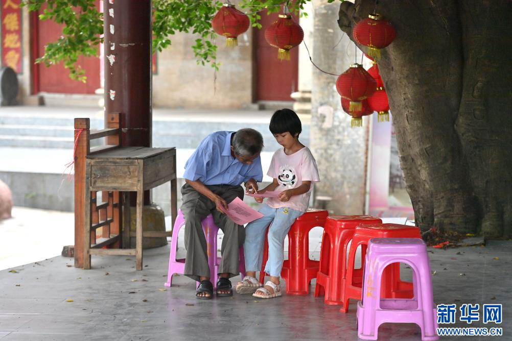 在梧州市長洲區長洲鎮泗洲村,陳明仲(左)在教小學生唱下俚歌(8月24日攝)。