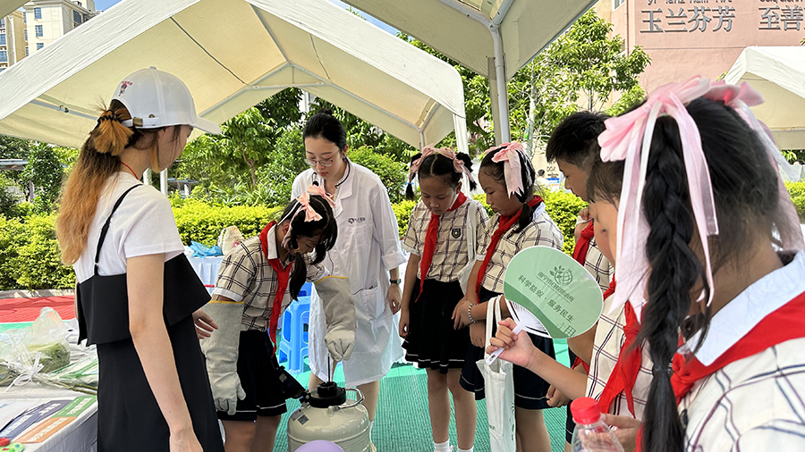 活動現場,南寧市科技館給玉蘭路小學的學生們帶來了精彩的科普秀表演和科學實驗秀,校園里豐富多樣的科普展覽,營造了愛科學、用科學、學科學的良好氛圍。