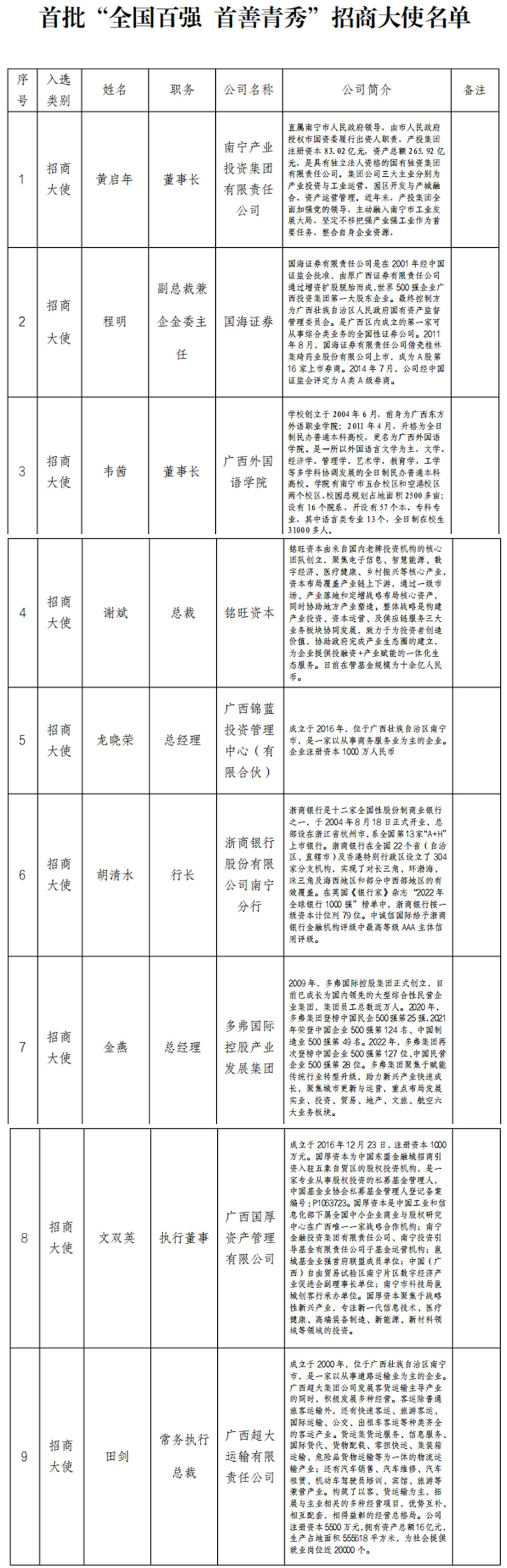 為充分調動更廣泛的社會力量支持參與招商工作,推動青秀區招商引資實現新突破、取得新成效,青秀區計劃禮聘在相關行業、領域擁有一定人脈、資源的個人和社會組織擔任青秀招商大使及鏈主企業。評選出符合青秀區開展招商工作要求的招商大使9位,推進強鏈補鏈延鏈工作要求的招商鏈主企業5家,具體名單如下。