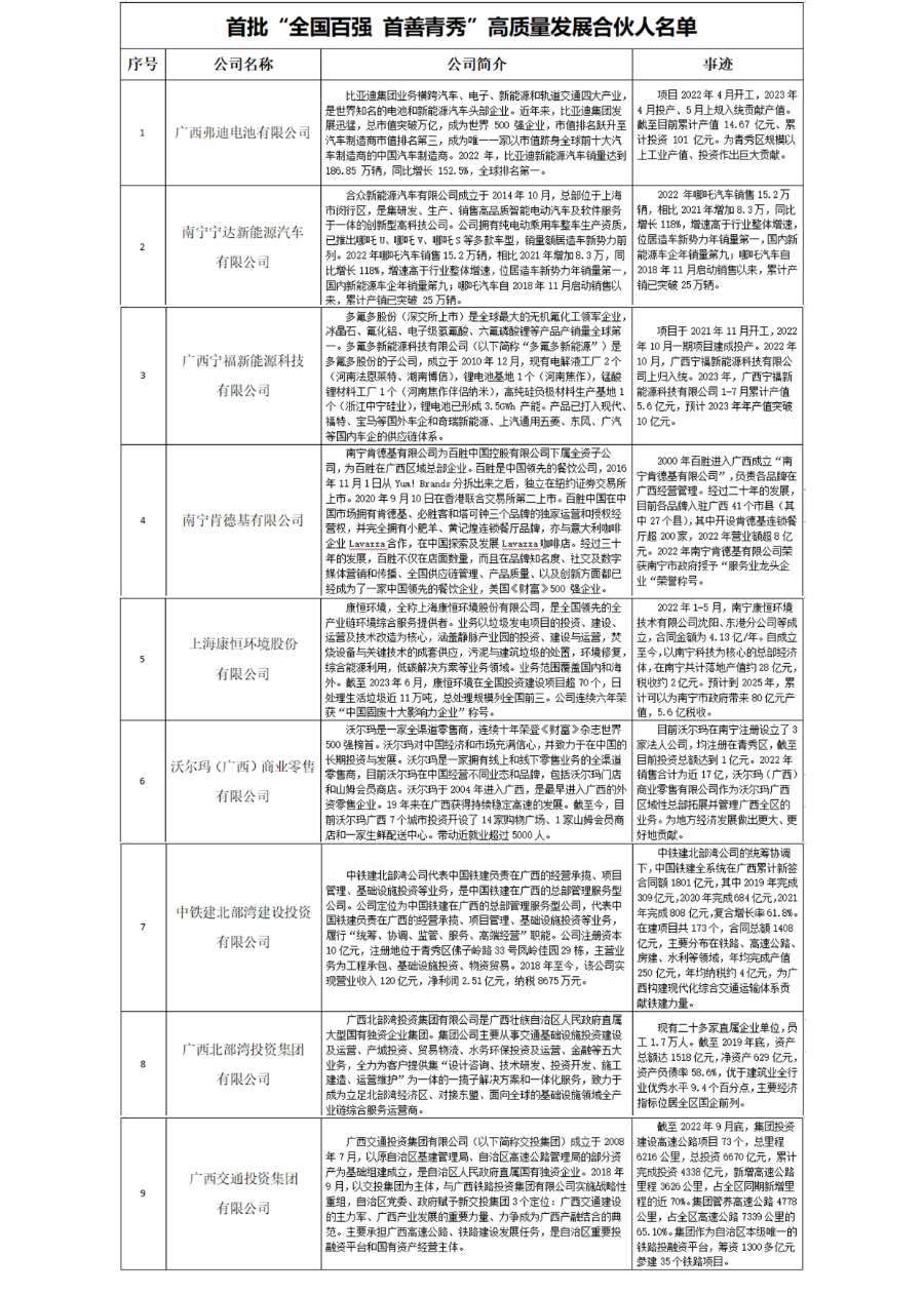 為表彰在推動青秀區高質量發展過程中提供智慧資源,與青秀區結成奮斗共同體,共擔風險、共歷艱辛、共享成功、共創未來的優秀合作伙伴,根據各行業龍頭企業為青秀區經濟發展、產業升級、招商引資、招才引智、提升青秀形象、宣傳推介青秀等工作中做出的貢獻,現評選出青秀區高質量發展合伙人企業9家,具體名單如下。