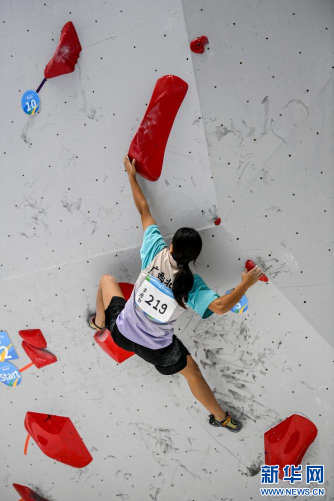 11月10日,在廣西馬山縣古零鎮初級中學攀巖館,李彥郯在第一屆全國學生(青年)運動會攀巖項目難度賽的比賽中。