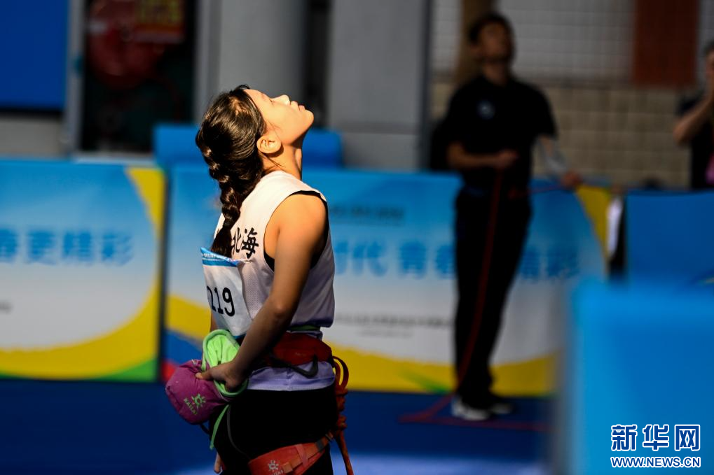 11月10日,在廣西馬山縣古零鎮初級中學攀巖館,李彥郯在第一屆全國學生(青年)運動會攀巖項目攀石賽比賽中觀察線路。