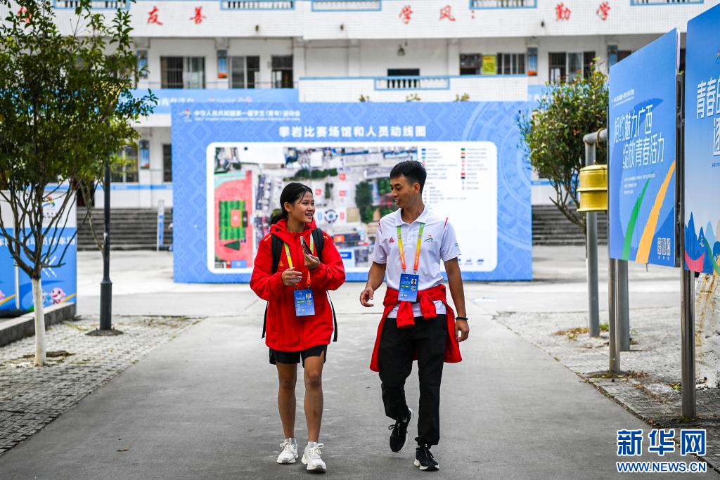 11月10日,在廣西馬山縣古零鎮初級中學,李彥郯(左)與教練吳國永交流。