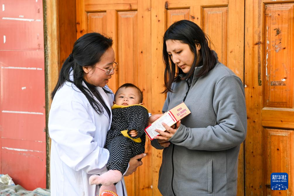12月6日,在廣西鐘山縣花山瑤族鄉林坪村,唐麗紅(左)給一名婦女講解嬰兒輔食營養包的使用方法。