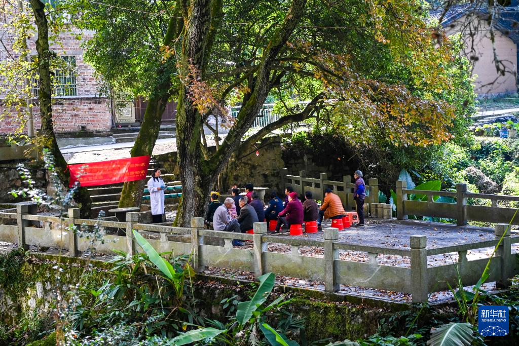 12月6日,在廣西鐘山縣花山瑤族鄉林坪村的一處空地上,唐麗紅(左一)為村民做健康知識宣講。