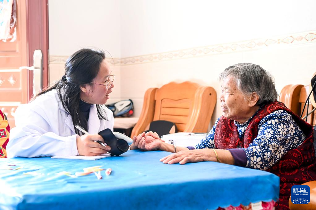 12月6日,在廣西鐘山縣花山瑤族鄉林坪村,唐麗紅(左)上門為老人做健康檢查。