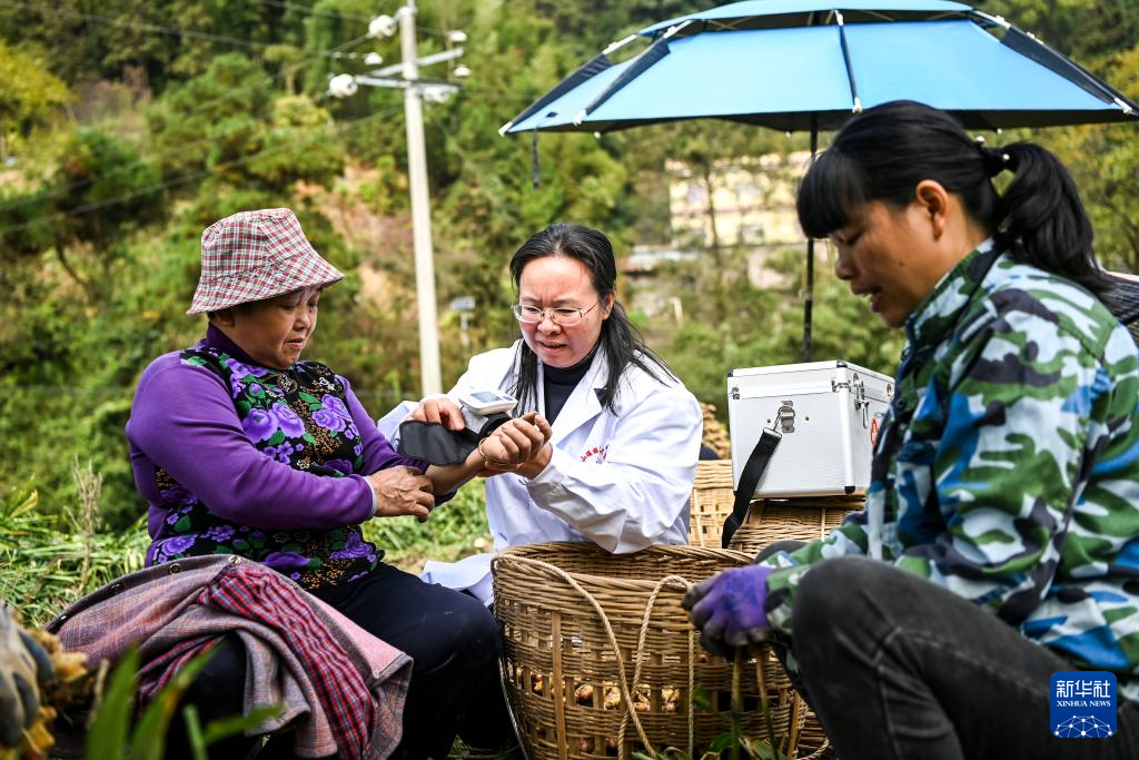 12月6日,在廣西鐘山縣花山瑤族鄉林坪村,唐麗紅(中)在田間地頭給村民測量血壓。
