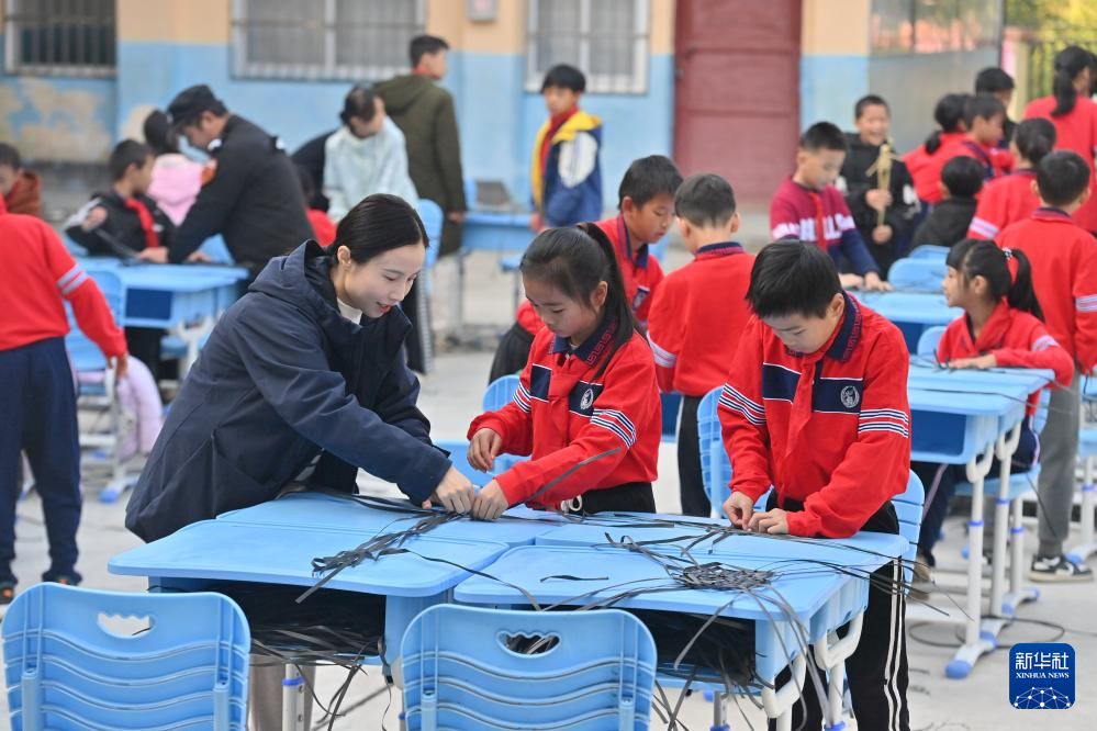 12月8日,在梧州市長洲區大橋小學,李煥然老師(右二)在課堂上指導學生編織手工藝品。
