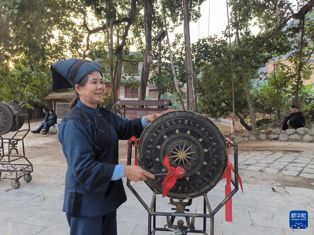 廣西崇左市寧明縣城中鎮耀達村村民呂細梅身著壯族服飾敲響銅鼓。新華社記者 郭軼凡 攝