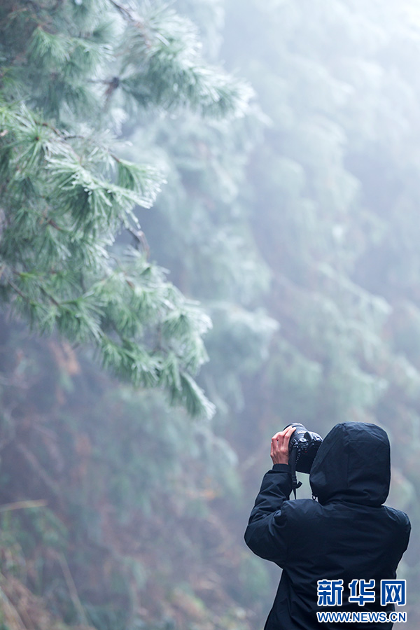 游客在廣西桂林靈川縣拍攝霧凇美景。新華網發 黃國秦 攝