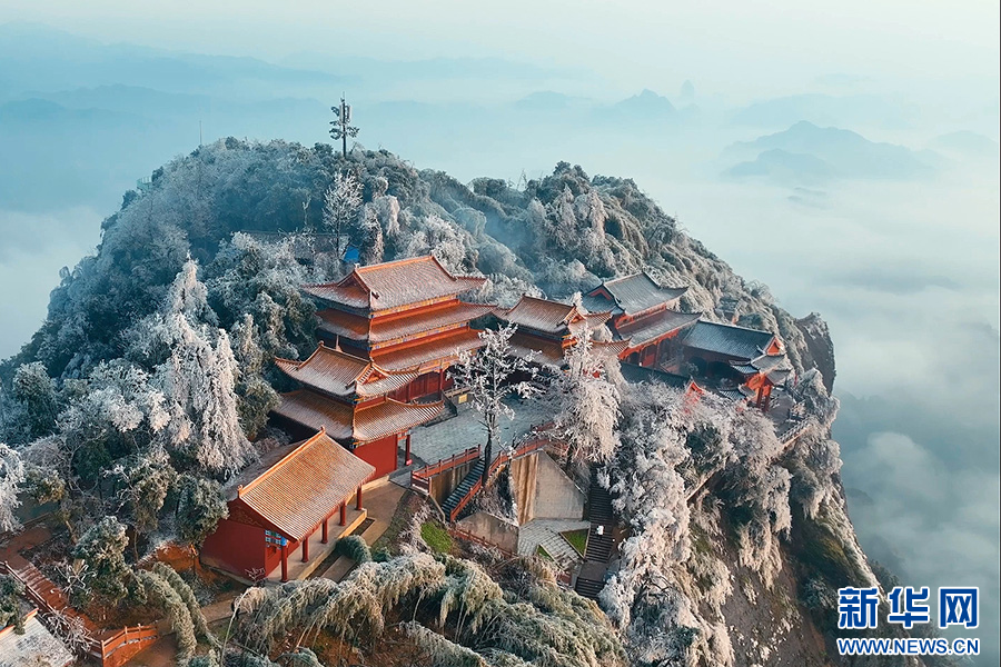 無人機航拍的“華南之巔”貓兒山景區雪景。(景區提供)