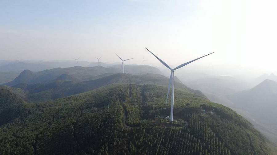 12月22日,走進合山洛山風電場,群山間一個個高大挺拔的白色“風車”矗立山頭,在藍天白云映襯下迎風轉動,形成一道獨特的風景。