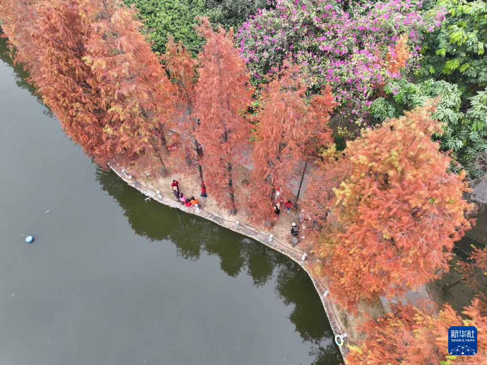 時下,廣西南寧市多個公園的杉樹“披”上紅裝,吸引了眾多市民前來觀賞。