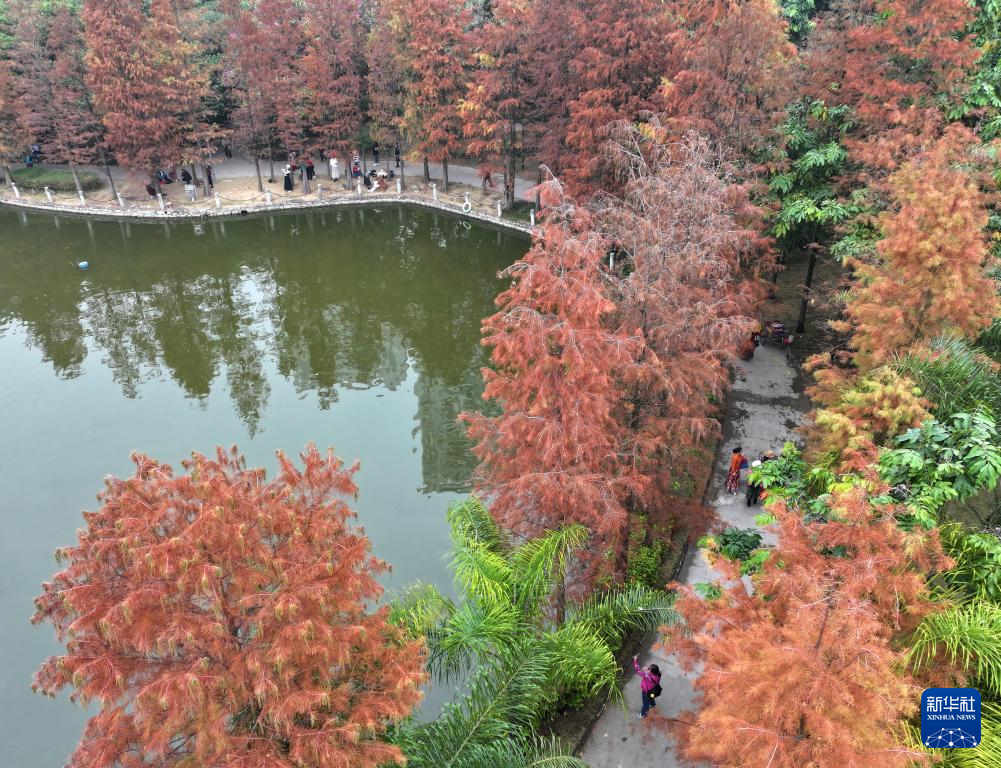 市民在廣西南寧市金花茶公園內紅艷的杉樹林里尋找冬味(1月6日攝,無人機照片)。