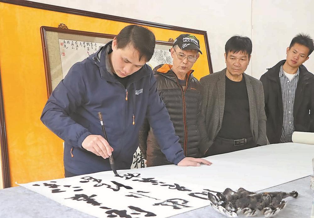 2月13日,忻城縣文聯開展2024年新時代文明實踐“我們的春節”主題活動,書畫家們齊聚一堂,互相交流學習,營造了喜慶祥和的節日氛圍。圖為忻城縣書法家協會會員在進行書法創作。(羅夏冰/攝)