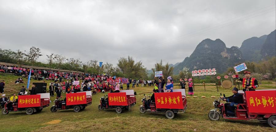 泗水旋歌地,孟儀時代春!3月30日,由河池市委網信辦、河池市融媒體中心主辦的主題為“唱壯美廣西 頌六新河池”的河池網紅歌圩暨東蘭縣泗孟鄉第三屆歌坡節在泗孟體育公園精彩舉行,活動吸引來自全市各縣(區)的網絡達人及山歌愛好者和游客逾萬人參加。