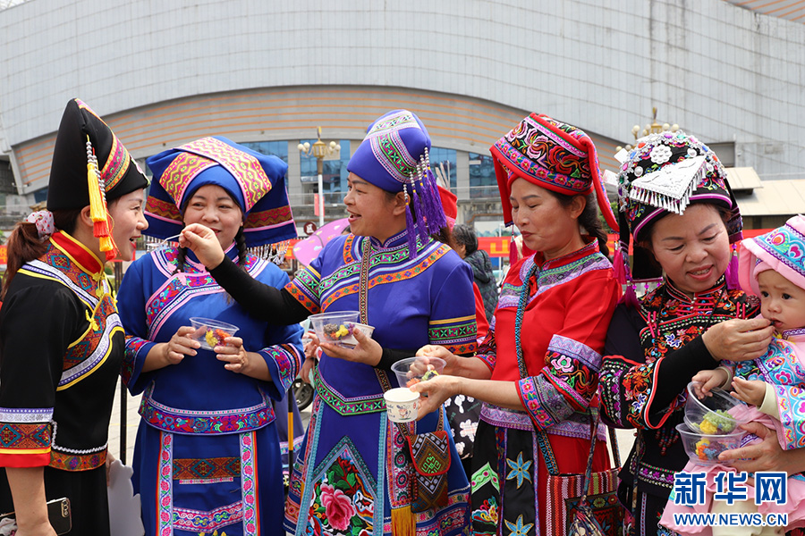 市民游客品嘗五色糯米飯