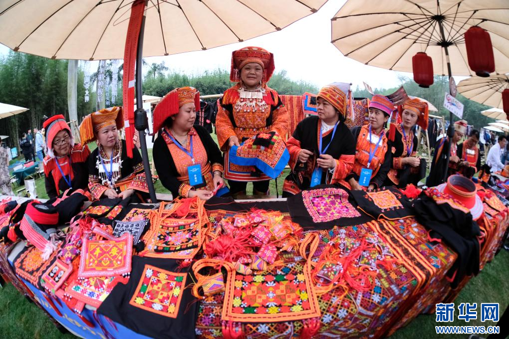 4月11日,瑤族繡娘在廣西南寧市青秀山主會場展示瑤繡。