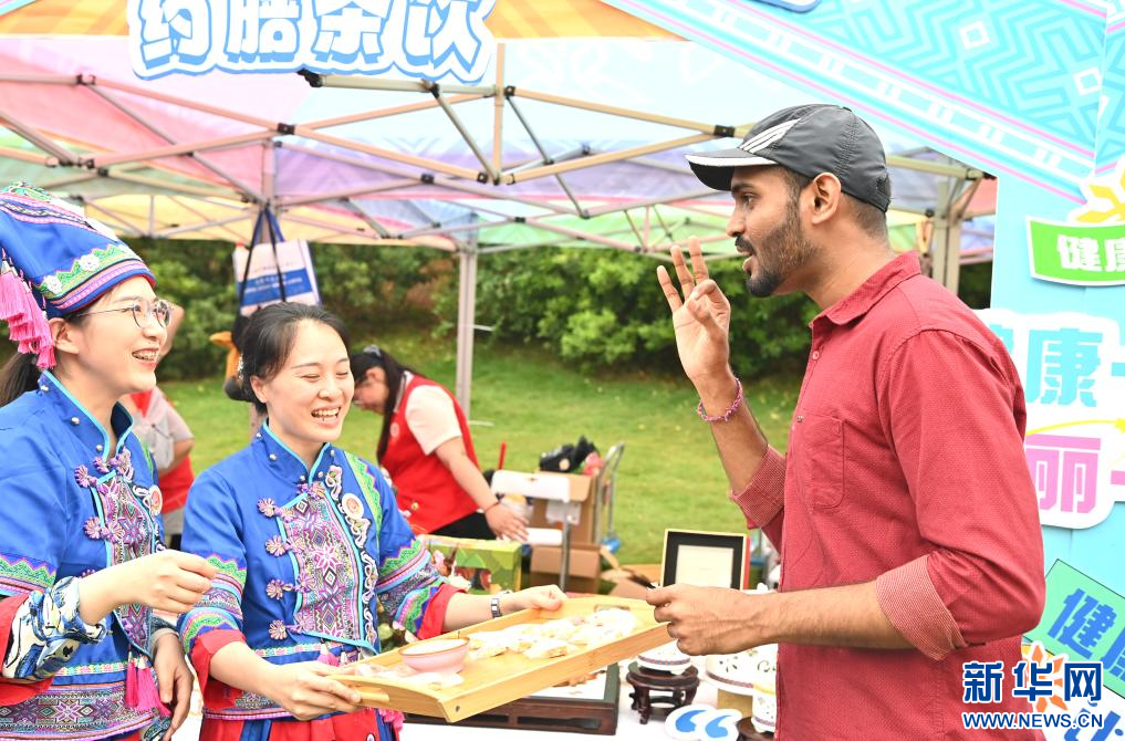 4月11日,一名外國游客在廣西南寧市青秀山主會場品嘗美食后做出“OK”手勢。