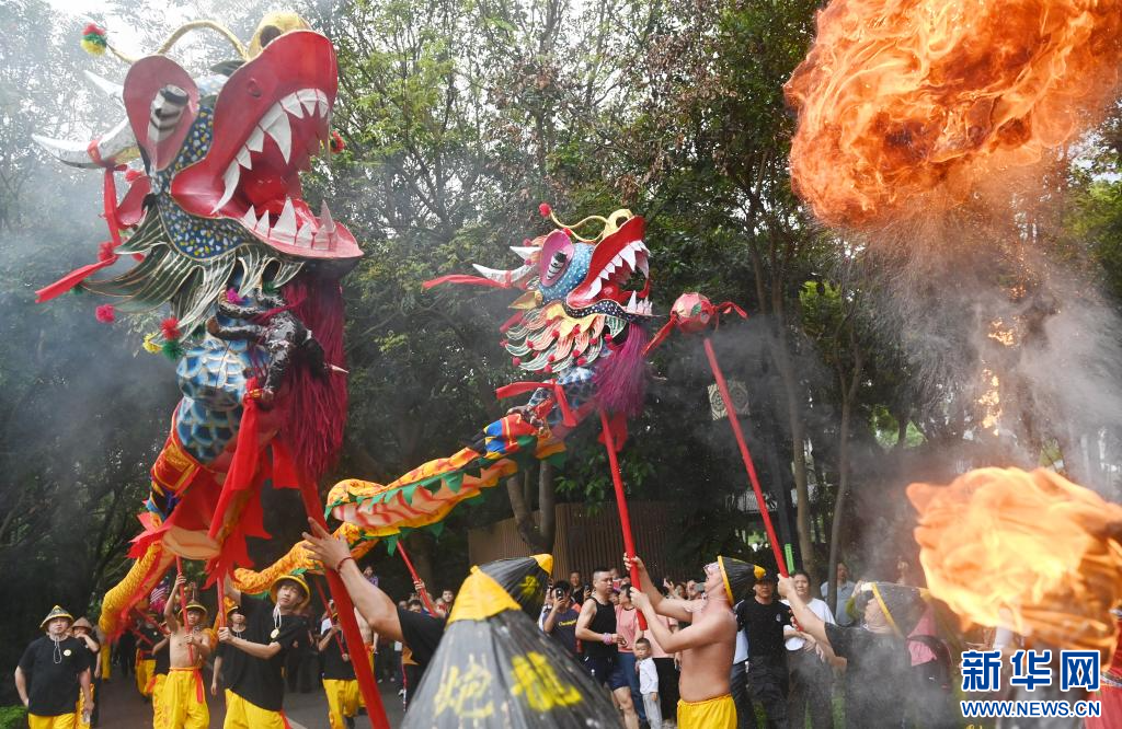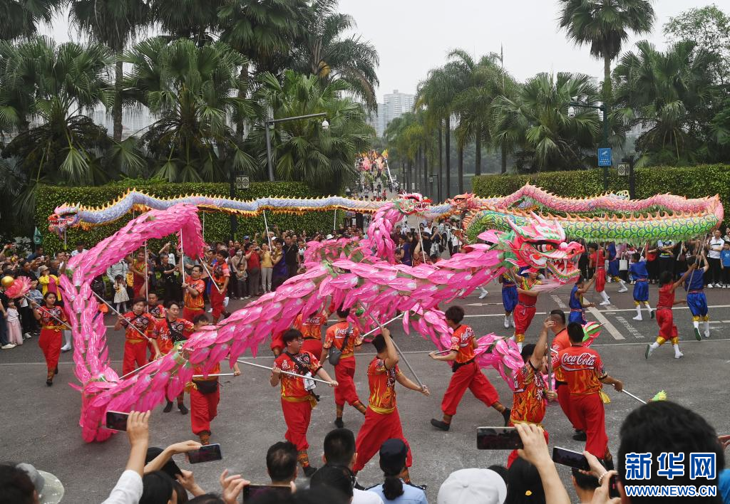 4月12日,舞龍隊在廣西南寧南湖公園巡游。