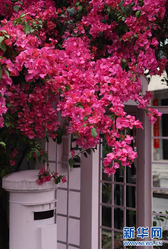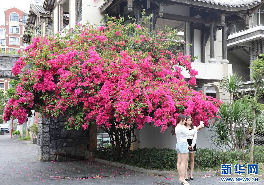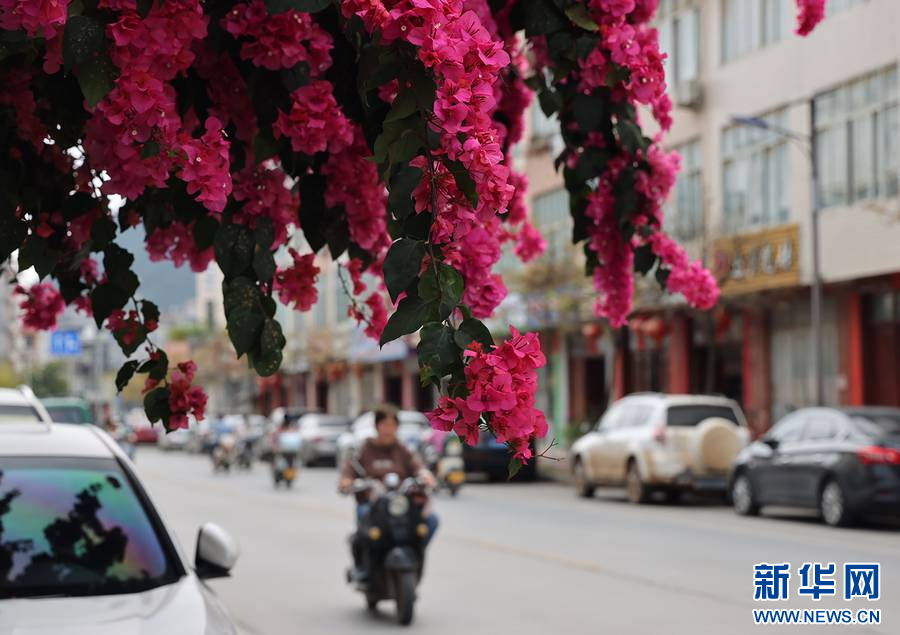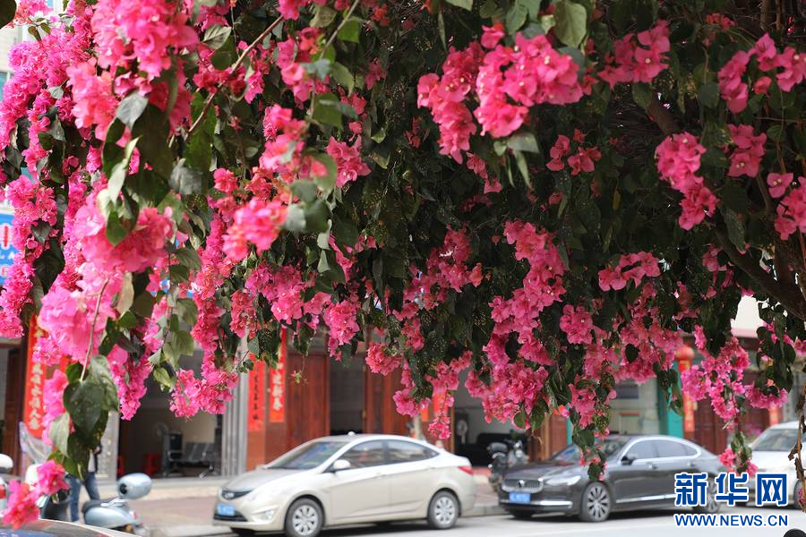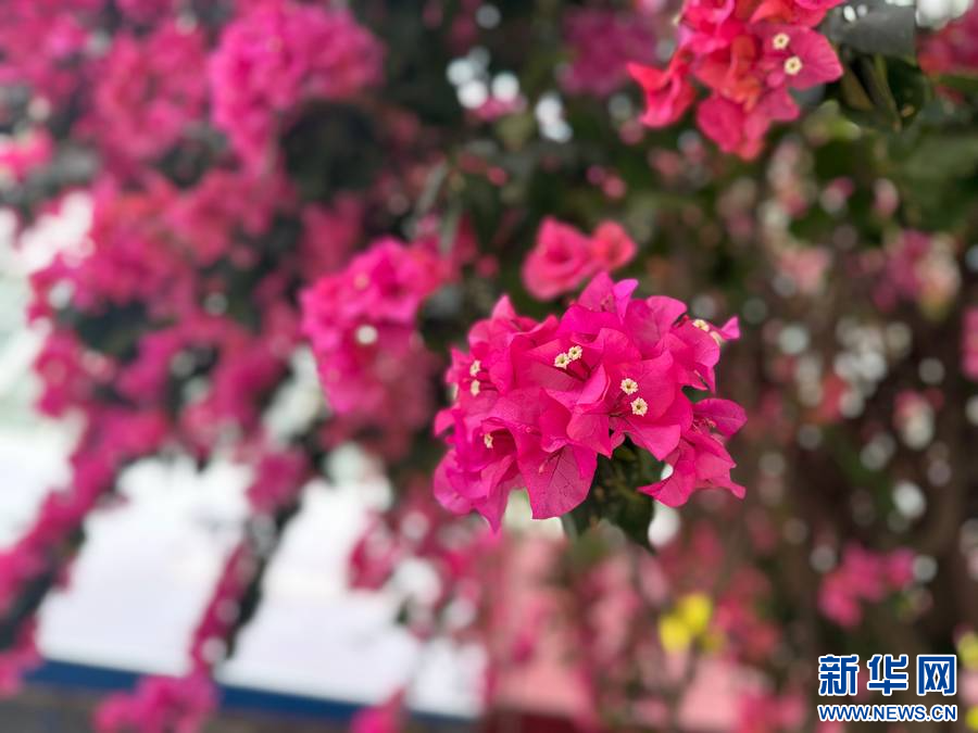 近日,隨著氣溫回升,廣西靖西市的三角梅進入盛放期,大街小巷的三角梅競相綻放,美麗春景吸引游客前來“打卡”拍照。