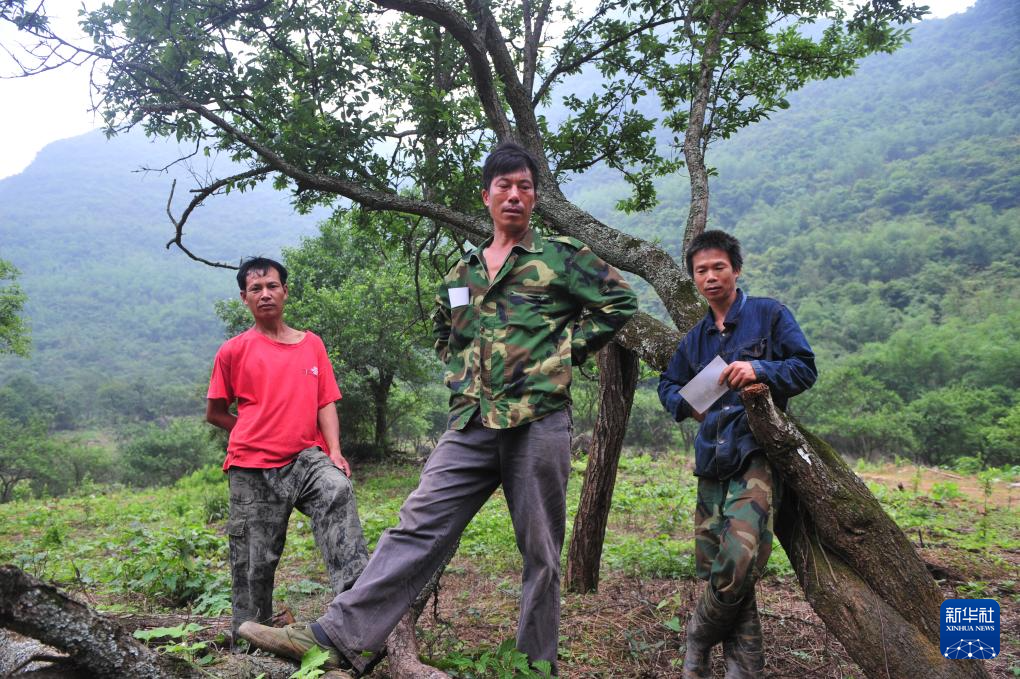 銅板屯村民龍革雄(右)、龍飛振(中)、莫仕和在山上休息,創業初期碰到的困難曾讓他們一籌莫展(2013年5月14日攝)。