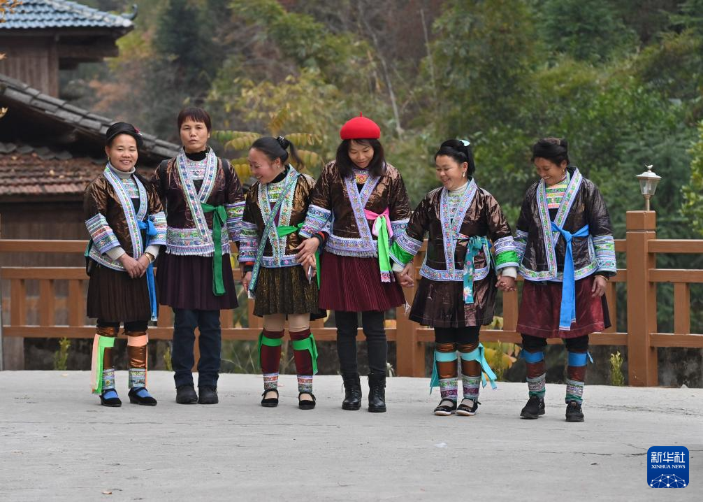 在融水苗族自治縣桿洞鄉烏英苗寨,銅板屯村民羅桂枝(左二)、楊莉(左四)和苗族婦女一起交流(2022年12月23日攝)。