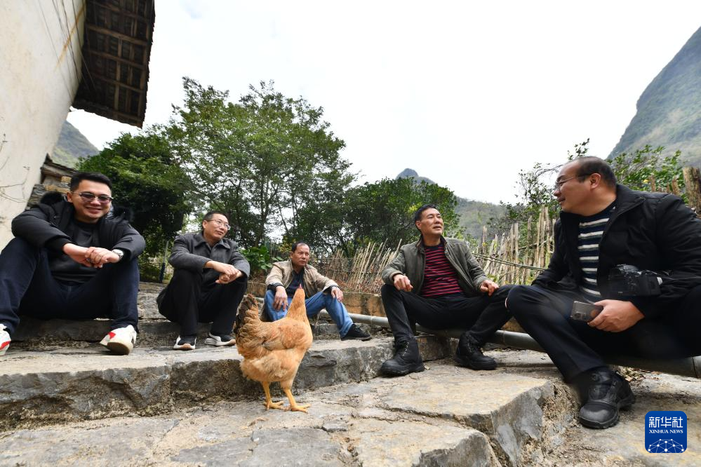 在融安縣東起鄉銅板屯,村民龍飛任(左一)向融水苗族自治縣桿洞鄉烏英苗寨的村民們介紹產業發展情況(2021年2月18日攝)。