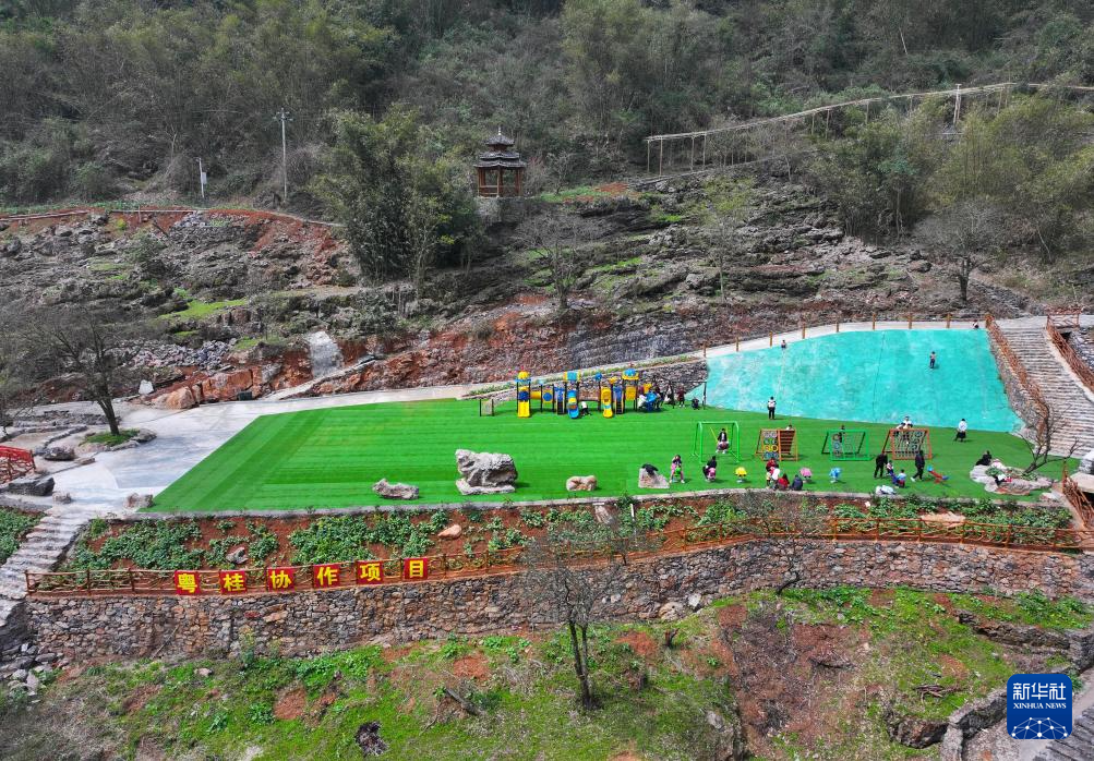 游客在銅板屯“粵桂協作團結廣場”上游玩(無人機照片,2024年3月3日攝)。