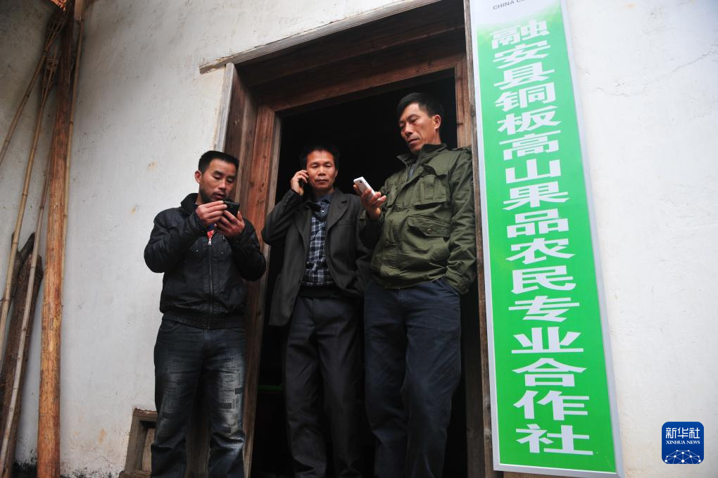 銅板屯村民龍革雄(中)、龍飛聯(左)、龍飛振在合作社辦公室門口(2014年2月21日攝)。