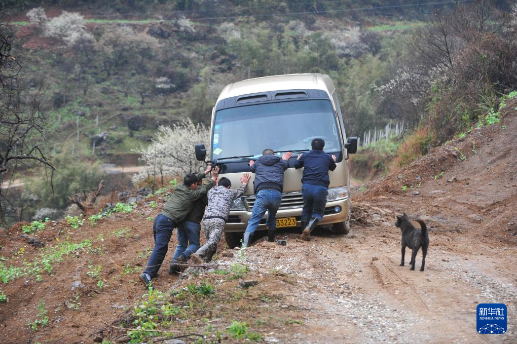 2014年2月22日,村民們推著汽車經過濕滑路段,準備進入銅板屯。