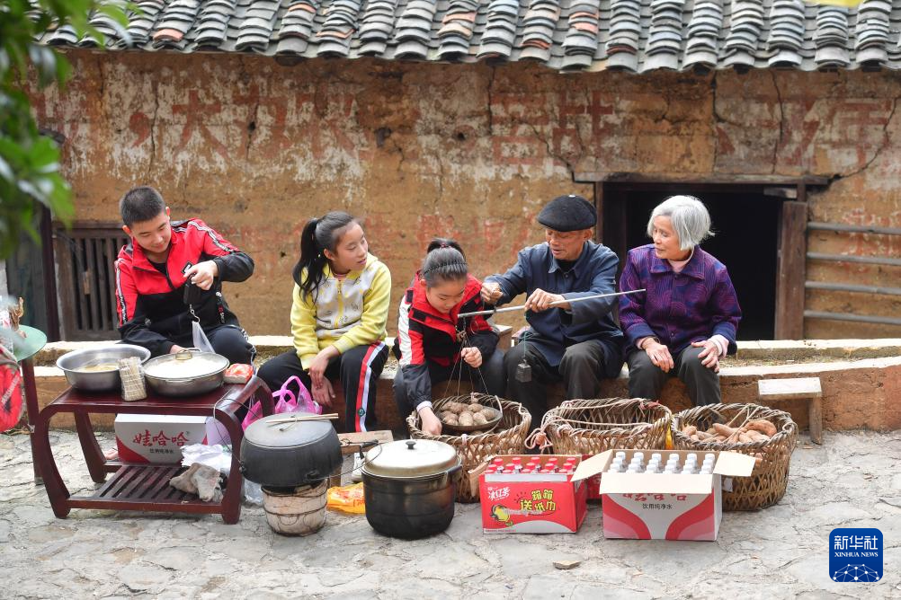 龍顯星老人(右二)帶著孫兒賣土特產(2021年2月15日攝)。