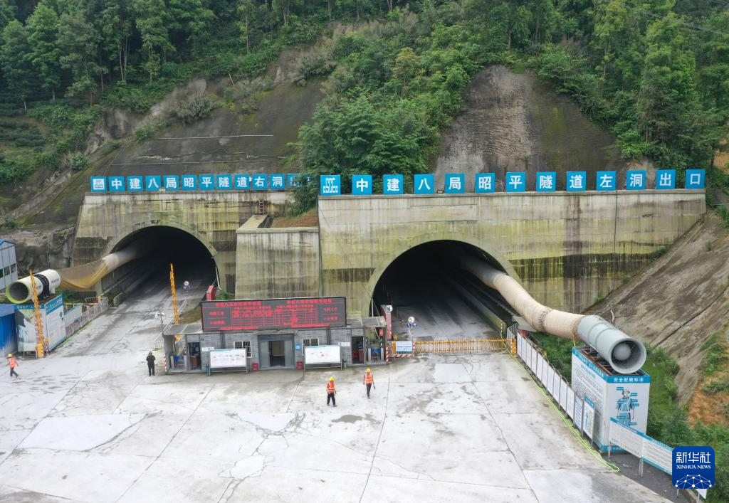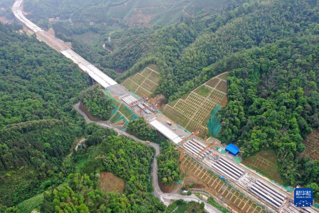 這是廣西昭平縣境內正在建設的蒼昭高速公路隧道(4月25日攝,無人機照片)。