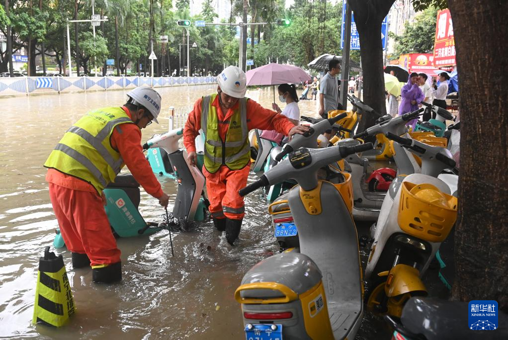 5月19日,工作人員守在南寧民族大道的積水處勸阻行人車輛不要通過。