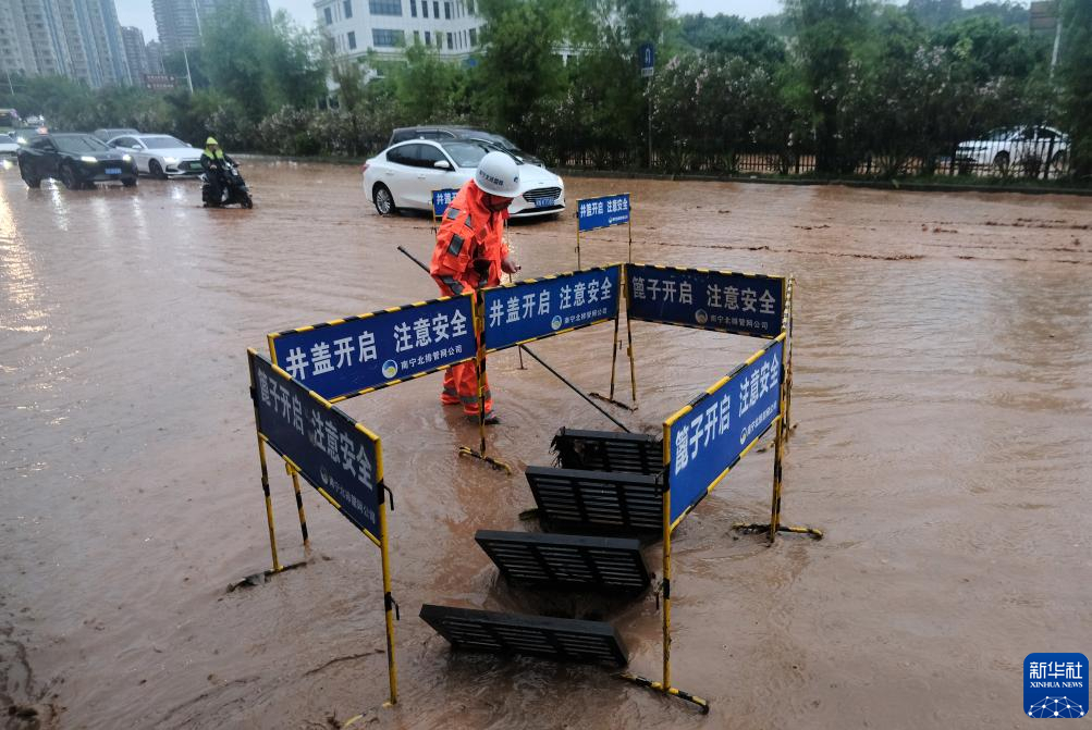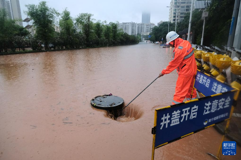 5月19日,在南寧青環路上,工作人員將下水道篦子打開加快積水下泄速度。