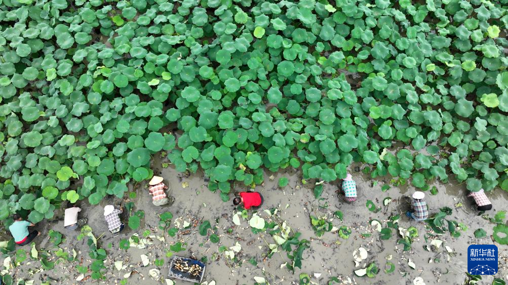 5月22日,在柳州市柳江區百朋鎮的雙季蓮藕種植基地,藕農在挖藕(無人機照片)。