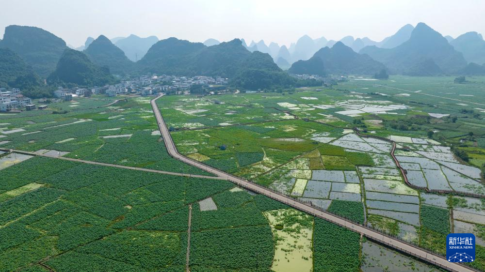 5月23日拍攝的柳州市柳江區百朋鎮的雙季蓮藕種植基地(無人機照片)。
