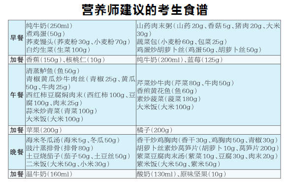 考生的飲食安排應注重種類多樣、合理搭配,注意主食、果蔬、肉蛋奶等食物的科學搭配。